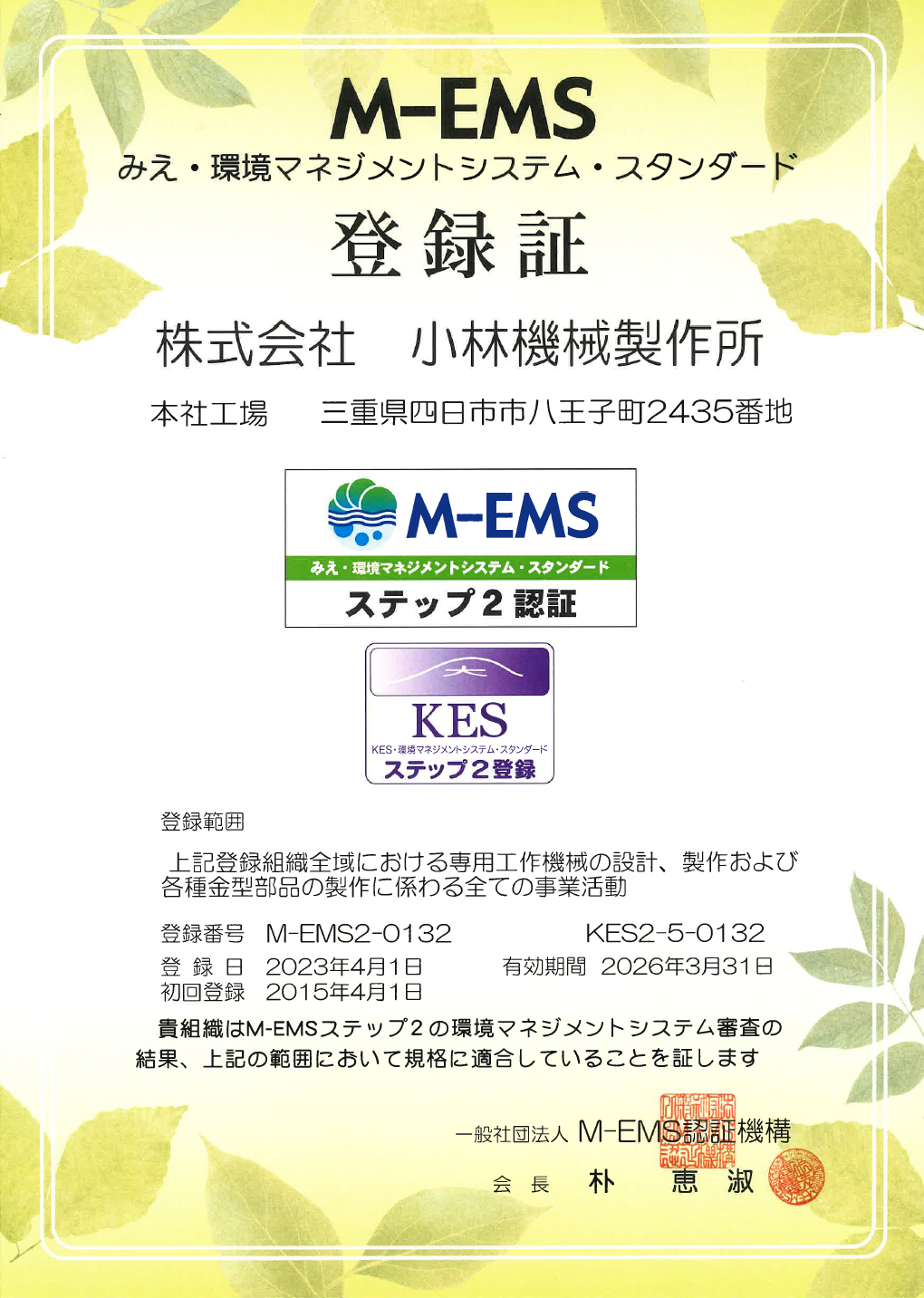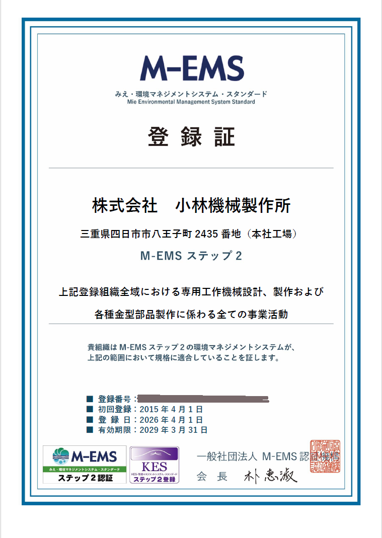 また、「みえ・環境マネジメントシステム・スタンダード『M-EMS』ステップ2」を認証取得し